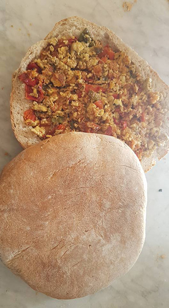 La base era una pagnotta parzialmente svuotata della mollica che veniva poi riutilizzata per zuppe e paste o in parte mescolata con il companatico che era composto da cipolla soffritta in strutto, peperoni dolci secchi detti bastardoni, si aggiungevano poi le uova rapidamente strapazzandole. Sì condiva il tutto con sale, abbondante timo e origano. Accompagnato con vino allungato e ingentilito da spicchi di limone, dava vigore per riprendere il duro lavoro campestre.